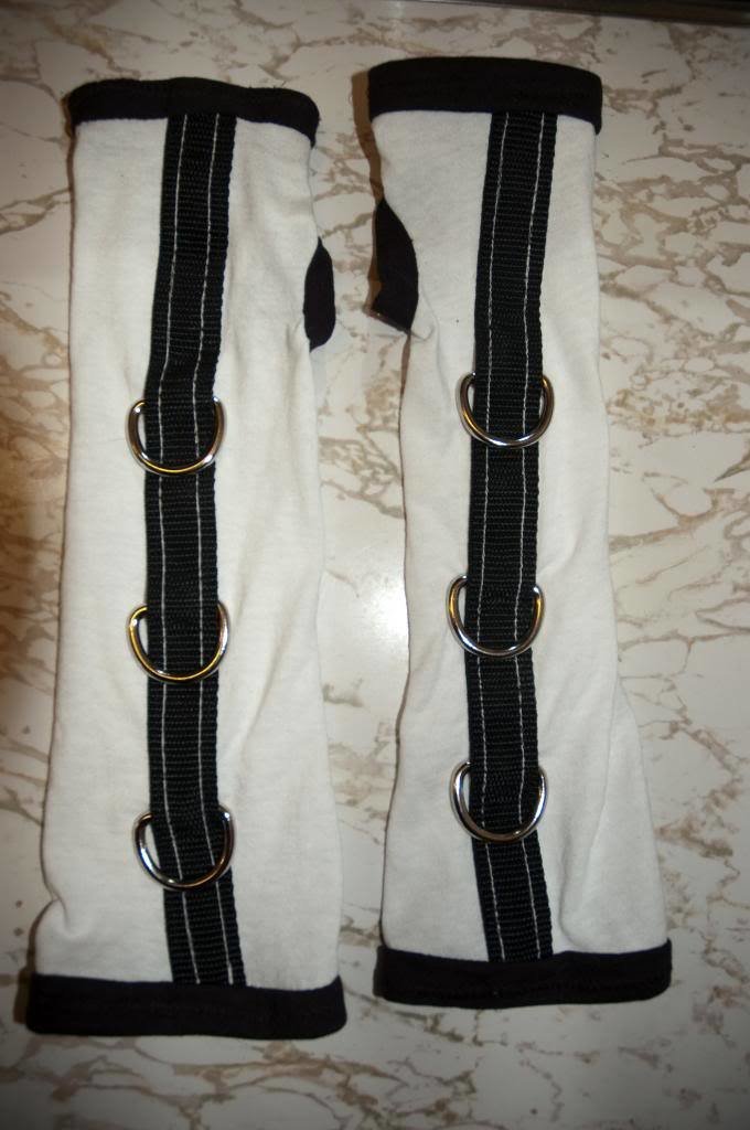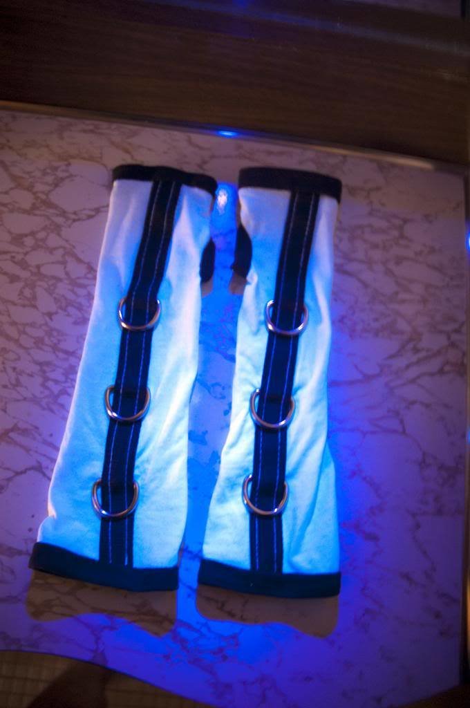 These black and white goth/punk style arm warmers are UV reactive, meaning that they glow brightly under a black light. The black borders, vertical black stripe with white accent thread, and silver D rings give these arm warmers a unique feel that you won’t see replicated anywhere but here!